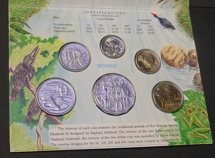 Australian mint or UNC coin set. Usual yellow plastic covering. Contains scarce 5c, 20c and 50c coins. Similar to photo. | $45 |