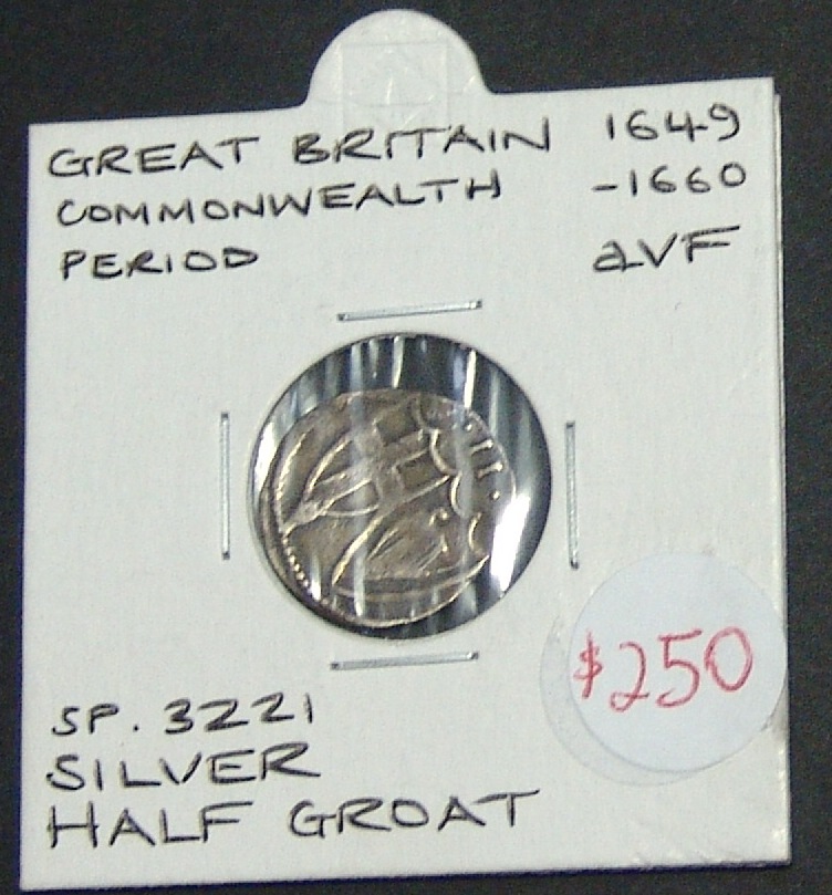 | ENGLAND. Commonwealth 1649-1660 period silver Half Groat. 16mm diameter, Seaby 3221. Near VF and scarce. | $250 |