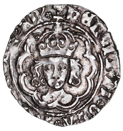 2210. Canterbury Mint, MM Tun/lis. Obv. Crowned facing bust within tressure of arches, no cusps.. HENRIC DI GRA REX