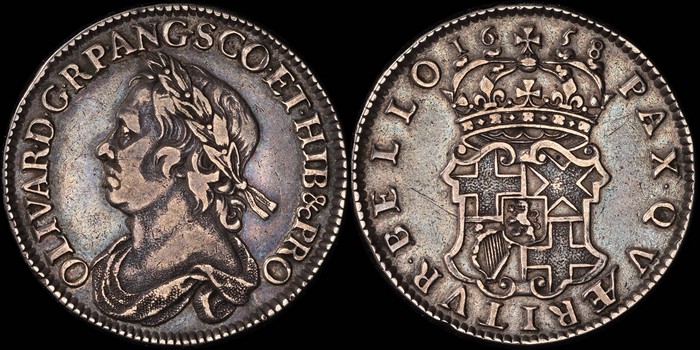 1658 Oliver Cromwell half crown. S 3227a, 14.89 grams, evenly toned mid grade, VF, very rare. | Sold |