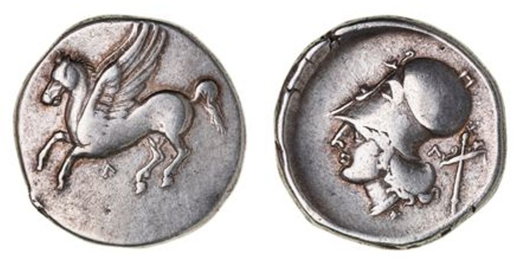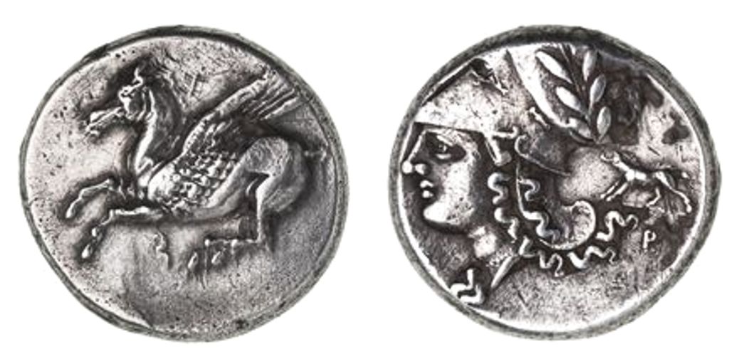 pegasos flying left, L below, rev. head of Athena wearing Corinthian