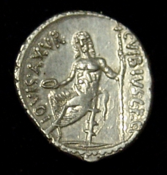 | Roman Republic, 48 BC, silver denarius. C.Vibius C.f. C.n Pansa. (19mm, 3.65 grams) Mask of bearded Pan/Jupiter seated left holding patera and sceptre. Sear 420. RRC 449/1. VF/gVF. | $375 |